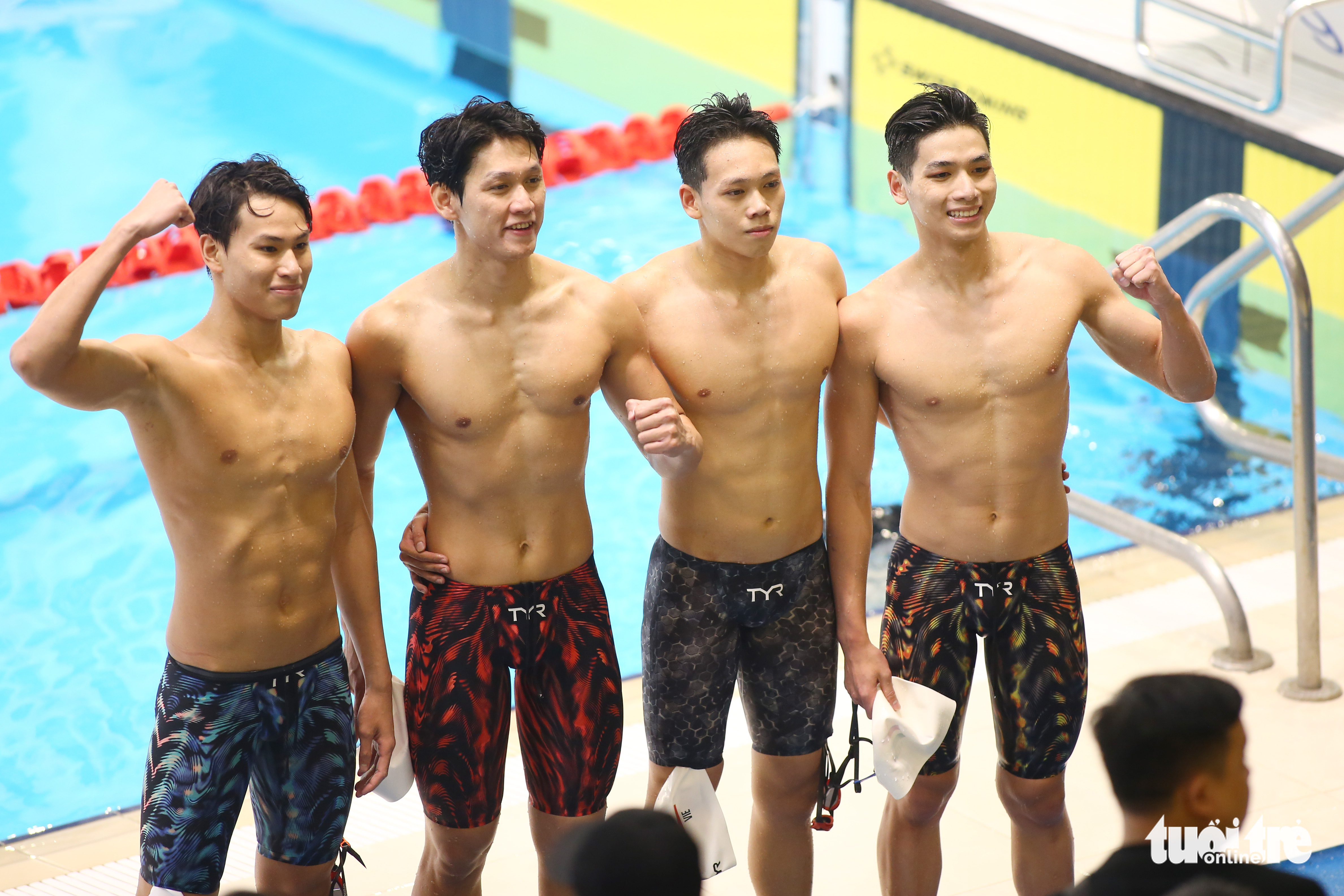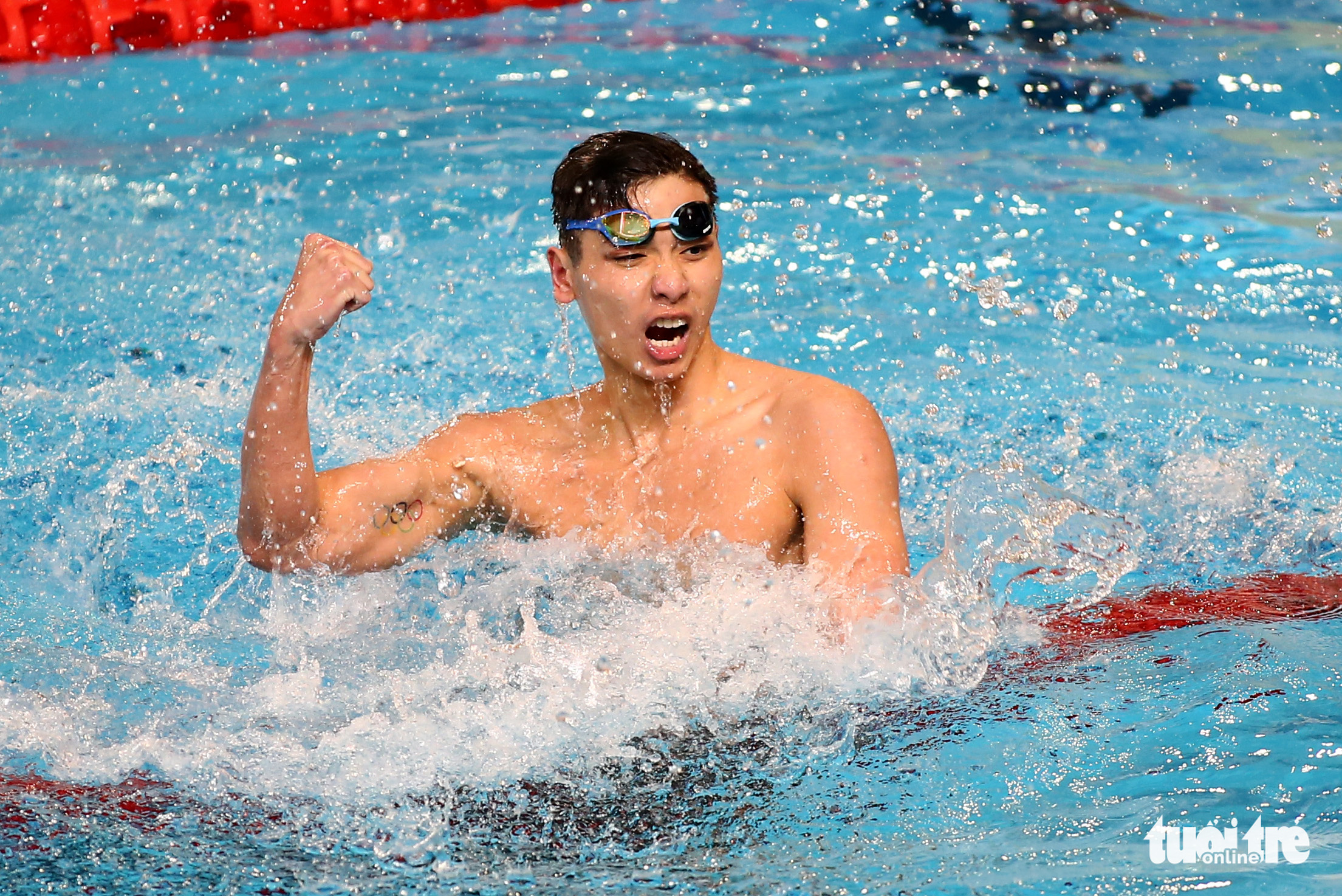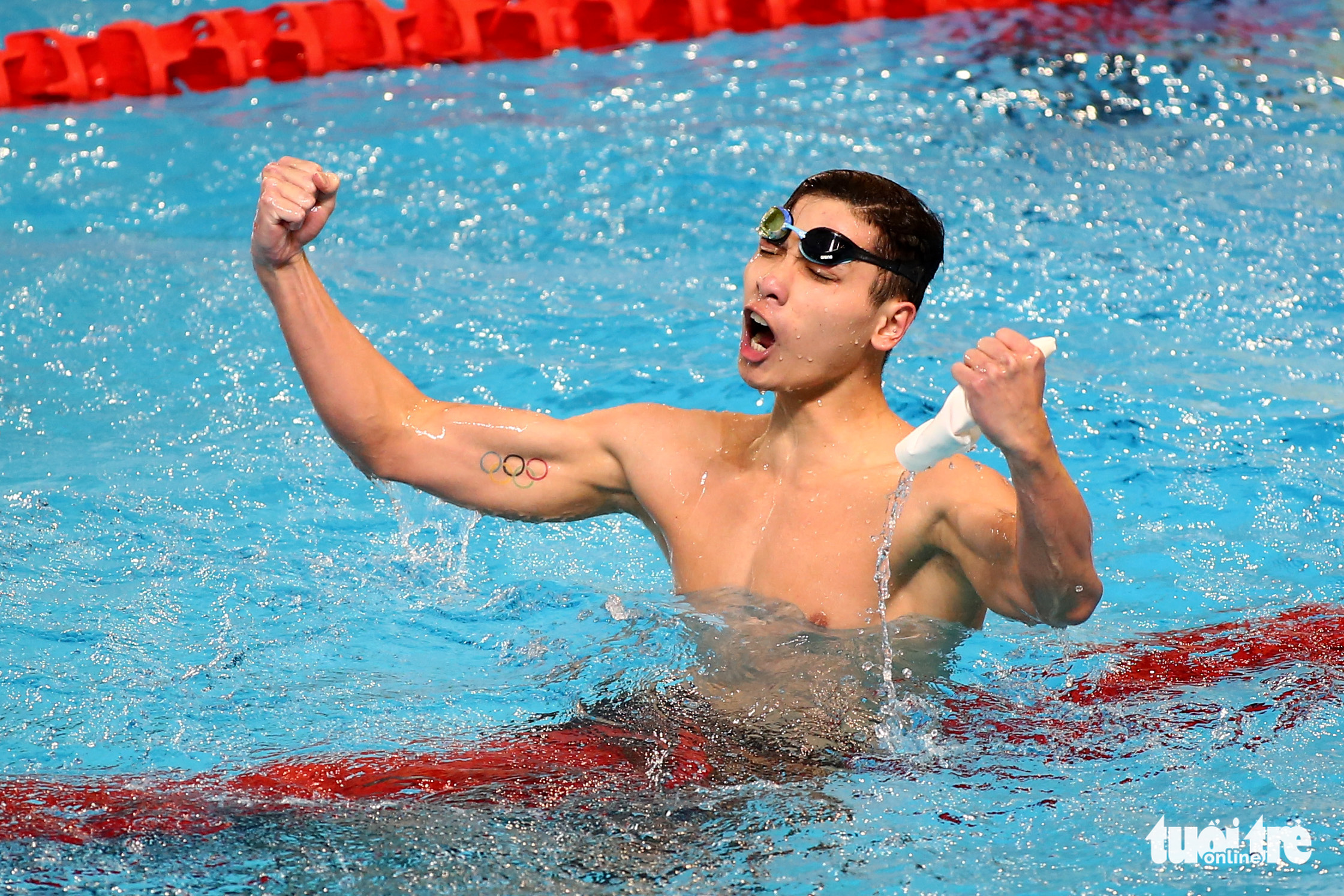 Niềm vui của Nguyễn Hữu Kim Sơn ở nội dung tiếp sức 4x200m tự do nam – Ảnh: H.TÙNG